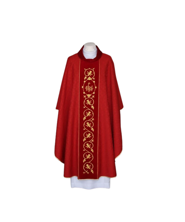 Ornat czerwony haftowany, tkanina adamaszek — IHS (21)