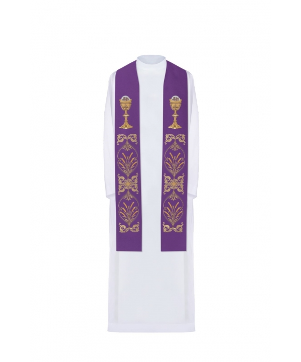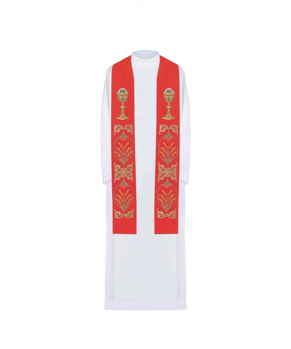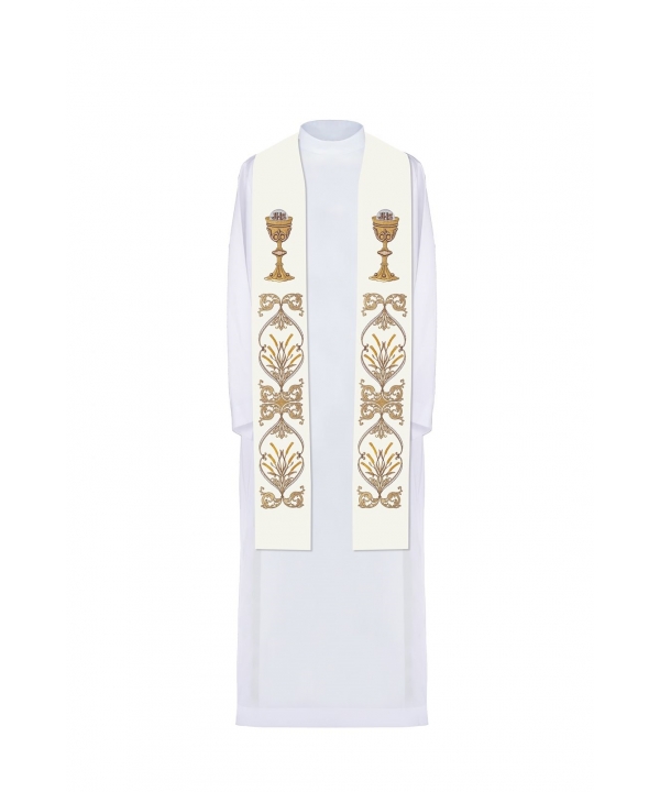Stuła jednostronna wykonana z wysokiej jakości tkaniny gładkiej, zdobiona bogatym eucharystyczny haftem w kolorze złotym, symbol IHS, kielich.