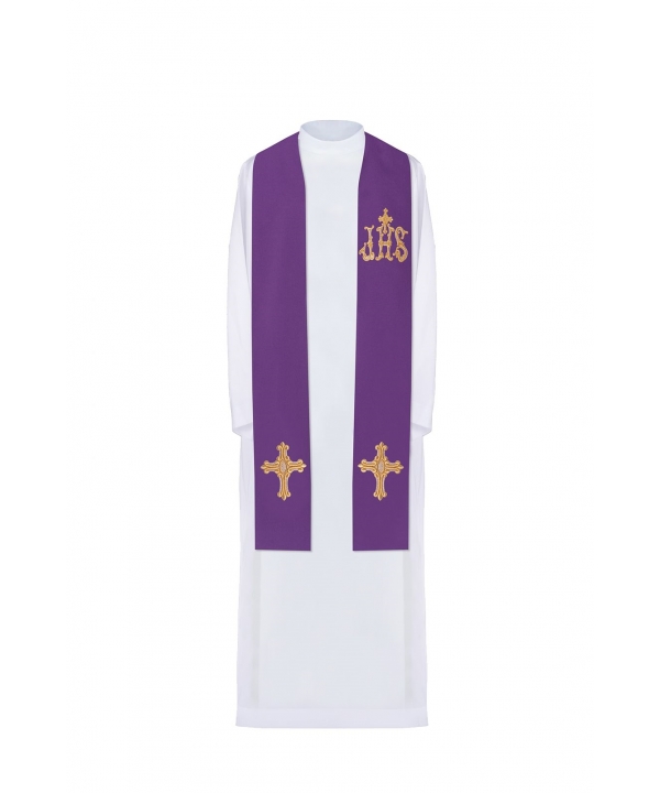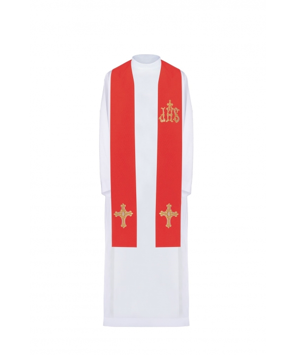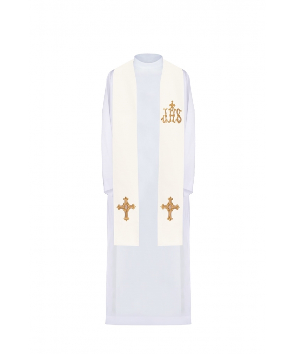 Stuła kapłańska wykonana z wysokiej jakości tkaniny gładkiej, zdobiona haftem z symbolem krzyża i IHS.