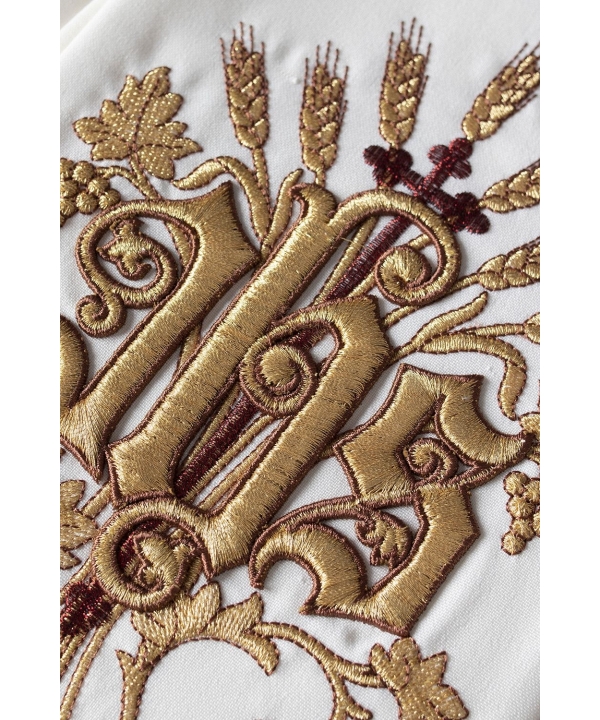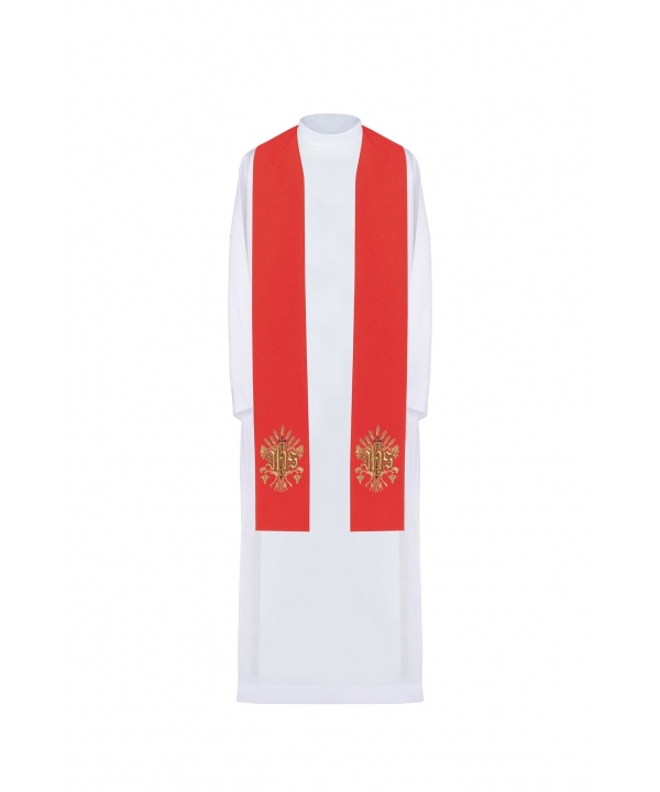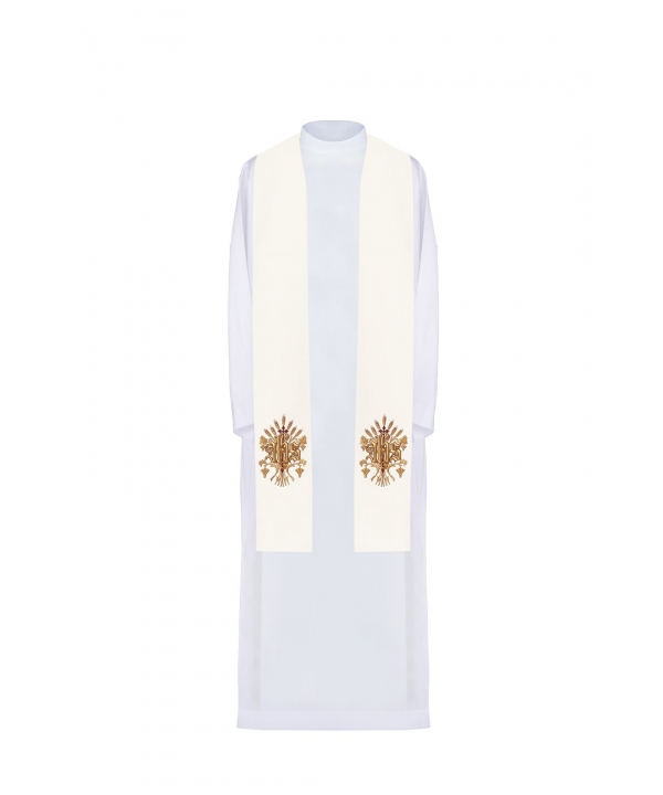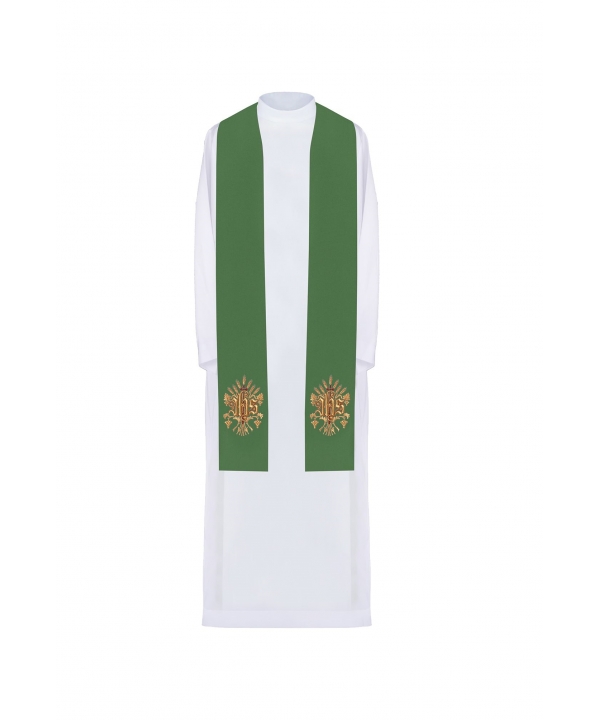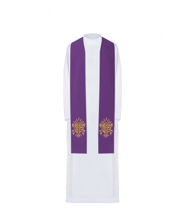 Stuła jednostronna wykonana z wysokiej jakości tkaniny gładkiej, zdobiona bogatym haftem IHS.
